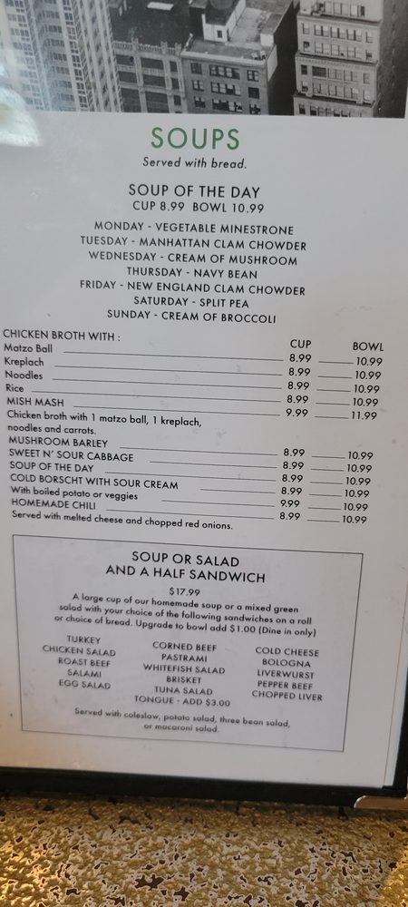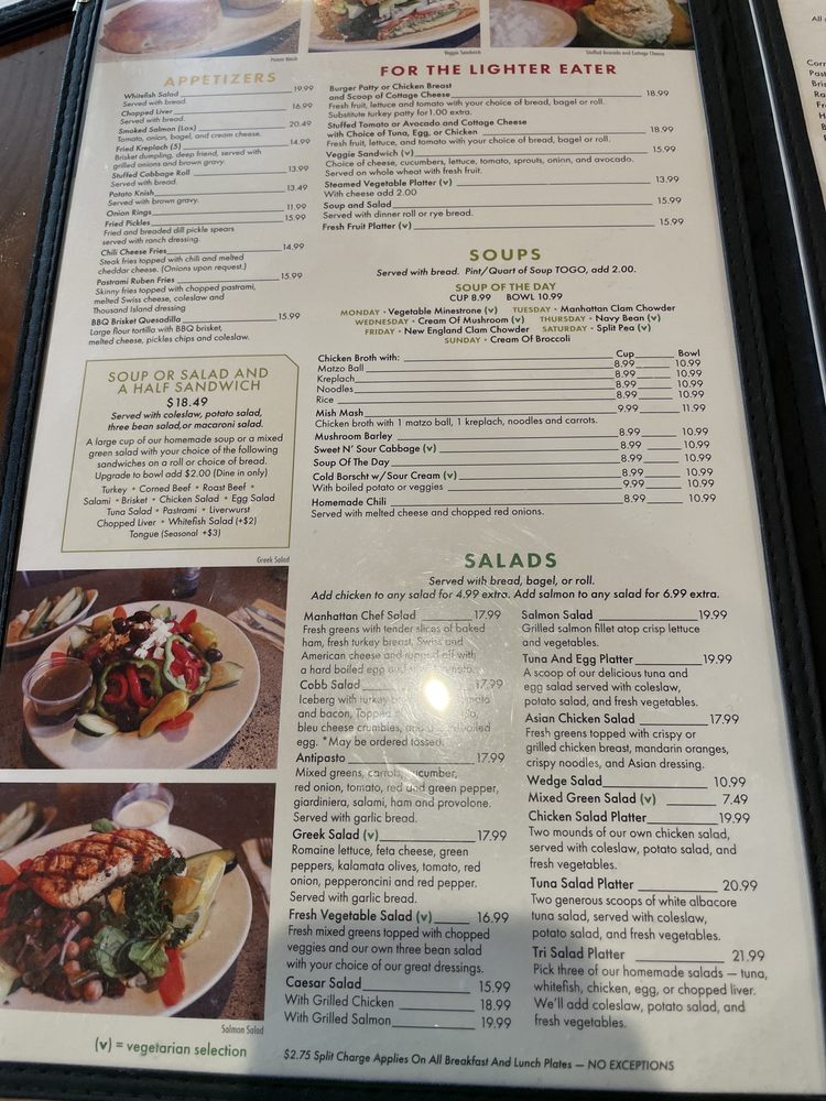 Half chicken boiled and covered with o rich chicken broth, topped with o big fluffy matzo boll, one kreploch, noodles and carrots, rye bread and butter. Served with dinner salad. (Excludes potato and vegetable choice)